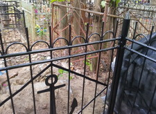 Далее демонтируем все с территории могилы и выпрямляем ограду. Для этого потребовалось полностью откопать две задние ножки, выпрямить ограду и заново залить цементом.
